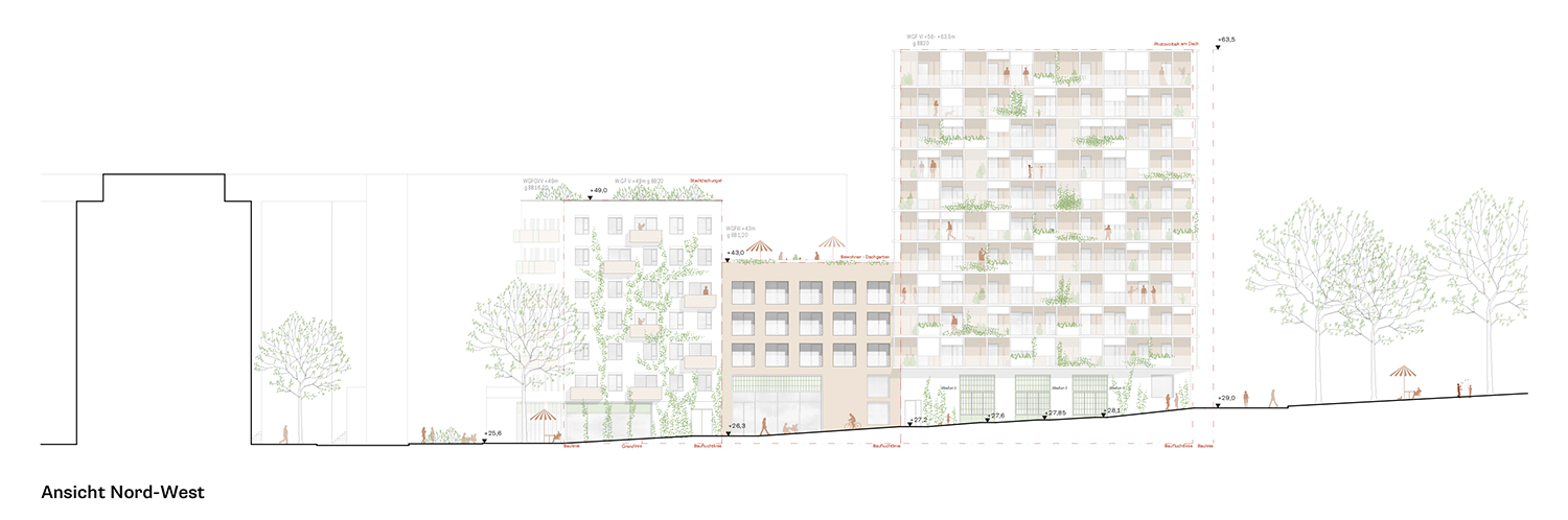- 35 PKW-Stellplätze in der hauseigenen Tiefgarage sowie 13 weitere PKW-Stellplätze auf BPL 12B geplant