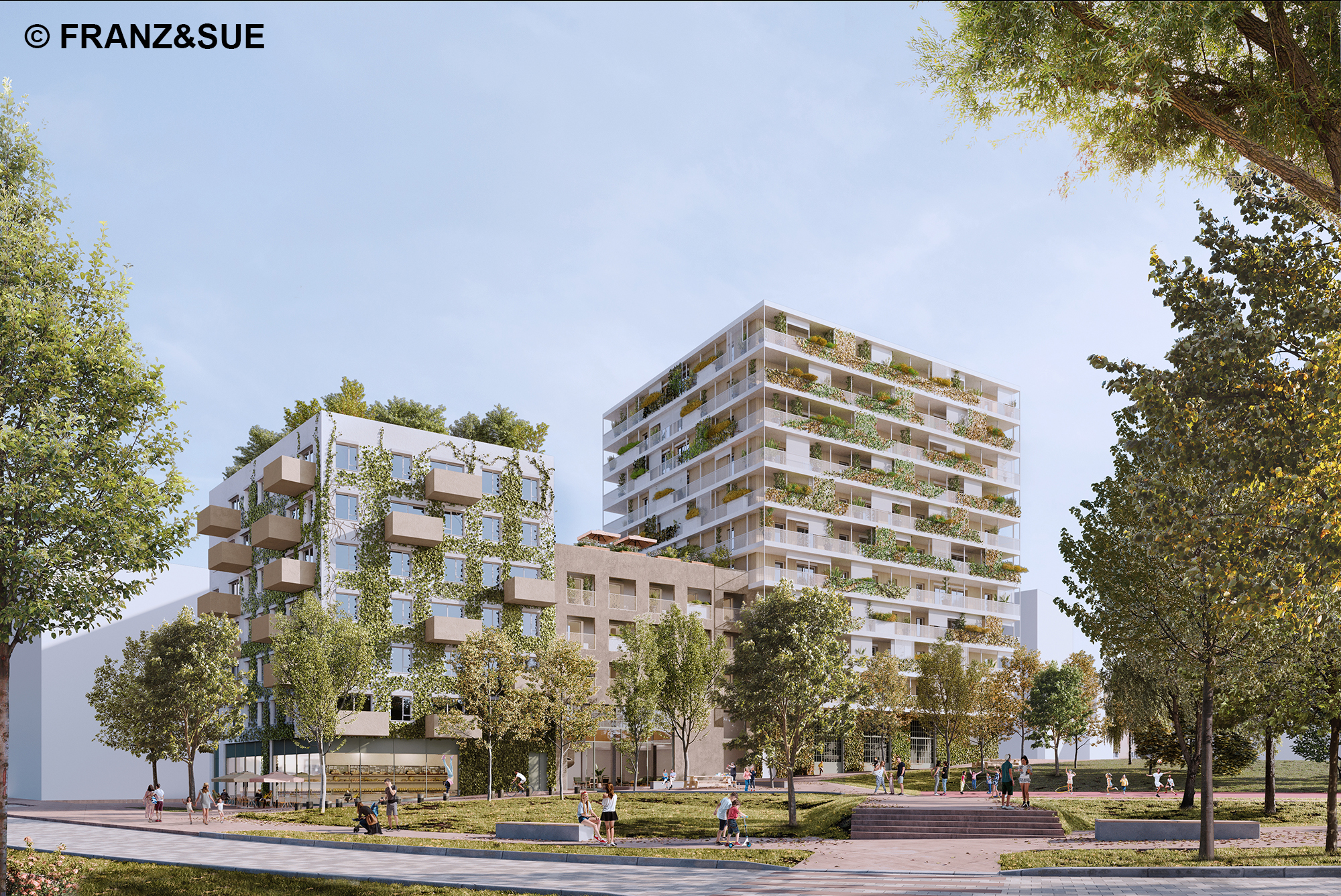 - Dachgarten mit abwechslungsreichem Aktivitätsangebot, Hochbeeten sowie Pergolen auf den Dachflächen von Haus B